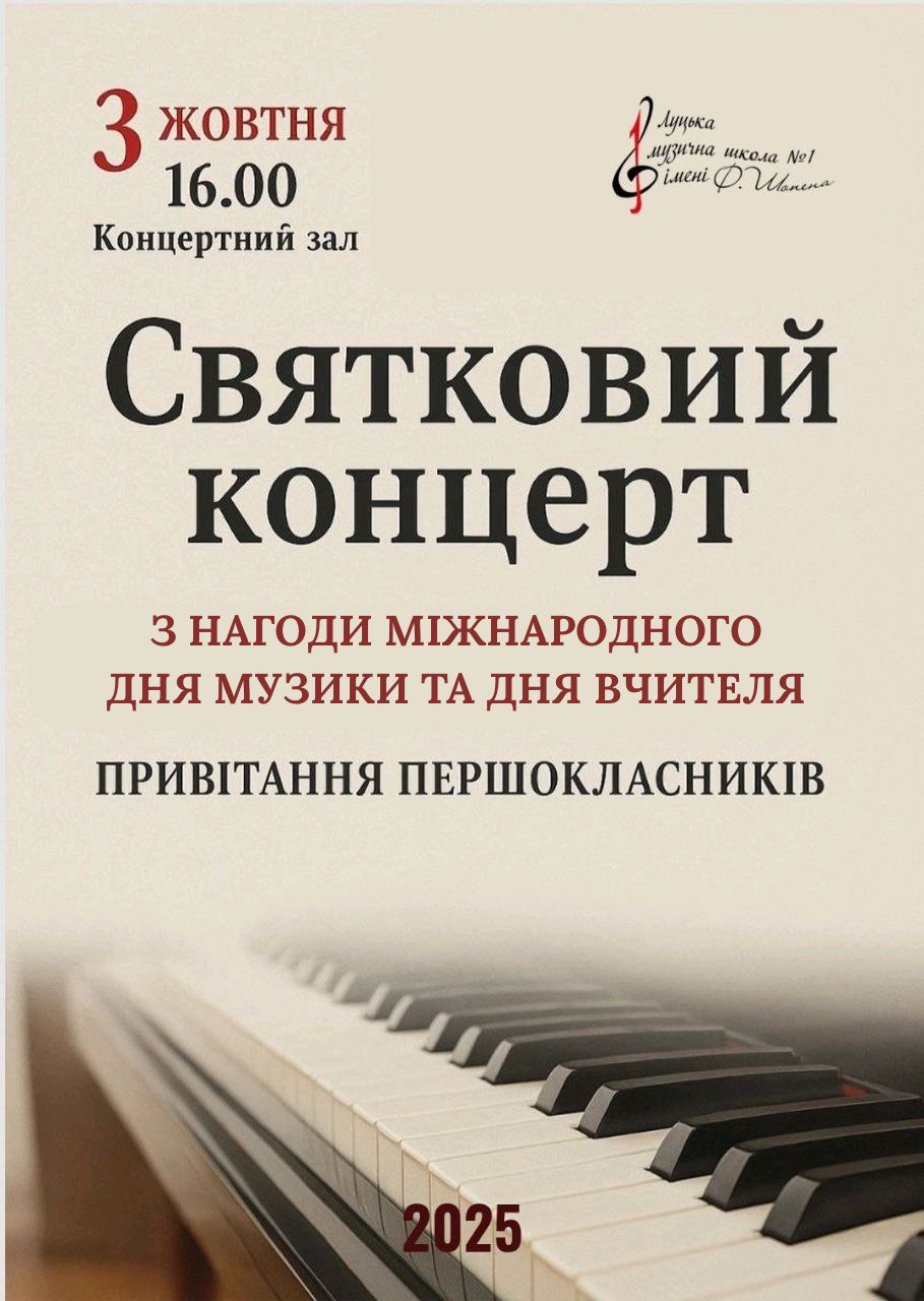 У Луцькій музичній школі №1 імені Фридерика Шопена відбувся святковий концерт з нагоди Міжнародного дня музики, Дня вчителя та вітання наших наймолодших учнів – першокласників. Найзворушливішим моментом заходу стало спільне...