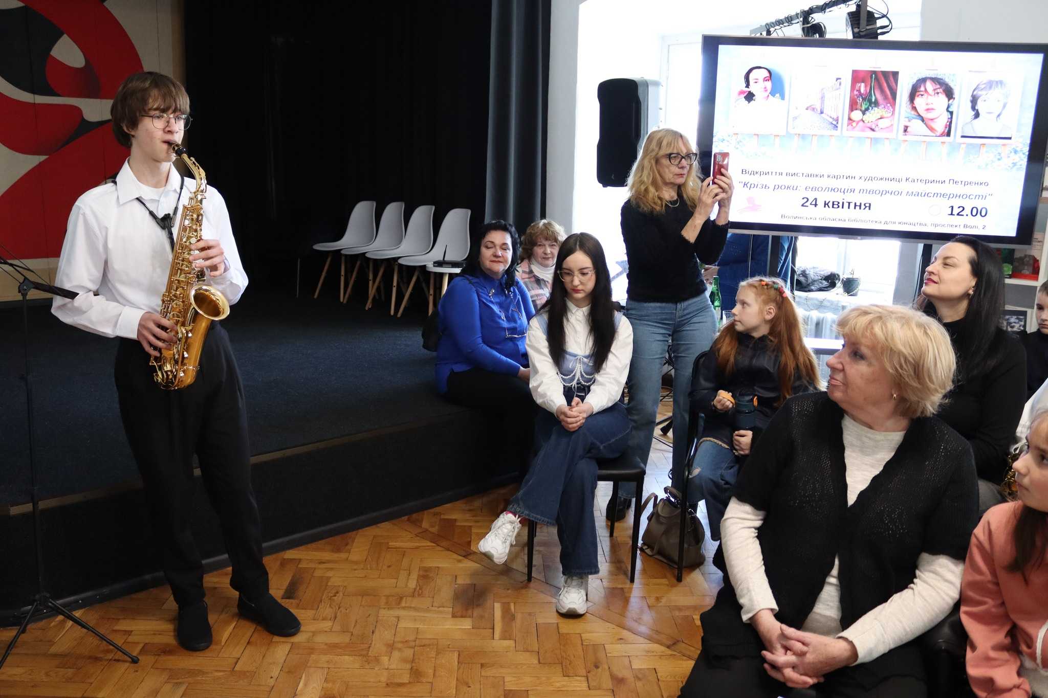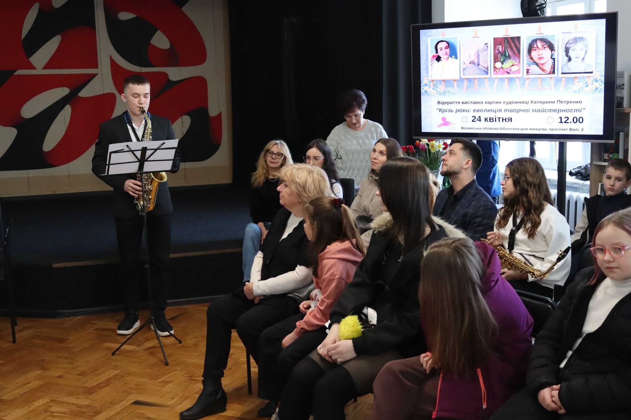 24 квітня у Волинській обласній бібліотеці для юнацтва відбулося відкриття виставки картин «Крізь роки: еволюція творчої майстерності» молодої художниці Катерини Петренко. Приємною окрасою заходу стали виступи учнів Луцької музичної школи №1 імені Фридерика Шопена. Саксофоністи Юрій Мельник, Софія Данилюк та Семен Троць (викладач Владислав Козицький, концертмейстер Олександра Хоруженко) подарували слухачам яскраві музичні номери, що гармонійно доповнили мистецьку атмосферу події.