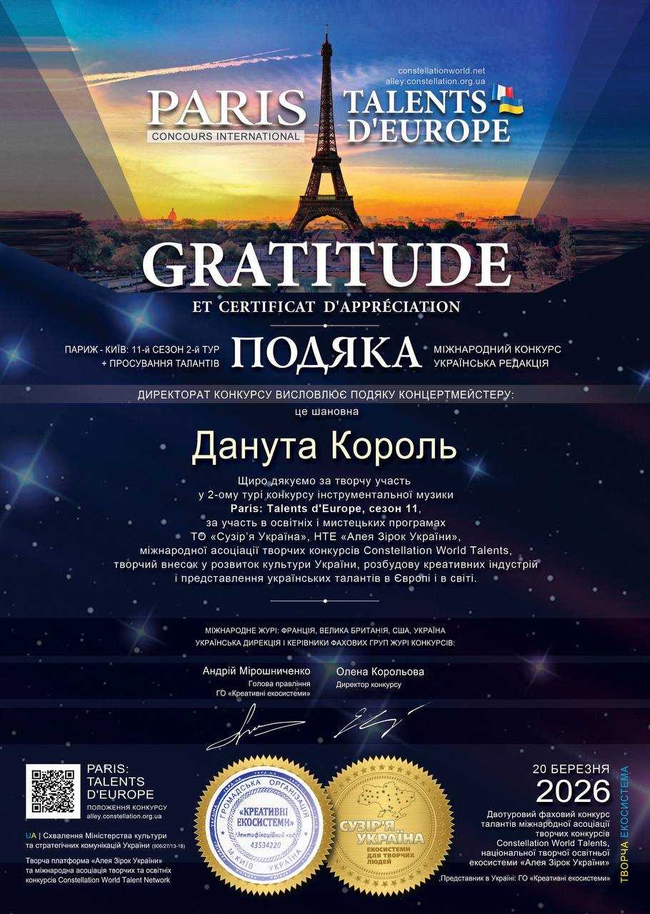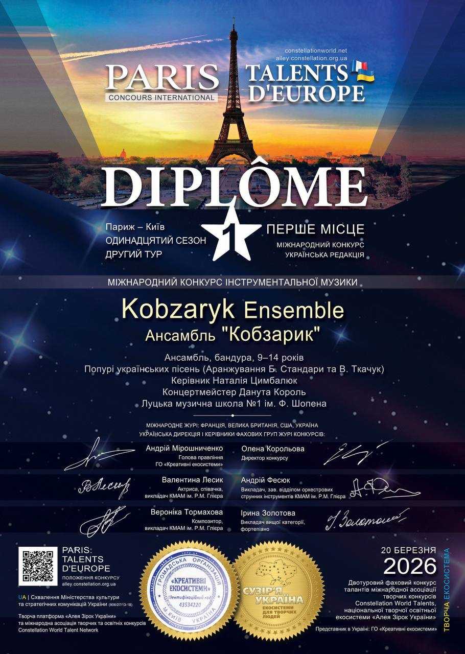 Ансамбль бандуристів «Кобзарик» Луцької музичної школи №1 імені Фридерика Шопена здобув І премію на міжнародному конкурсі інструментальної музики Paris Talents d’Europe (Париж–Київ, ІІ тур, 2026).