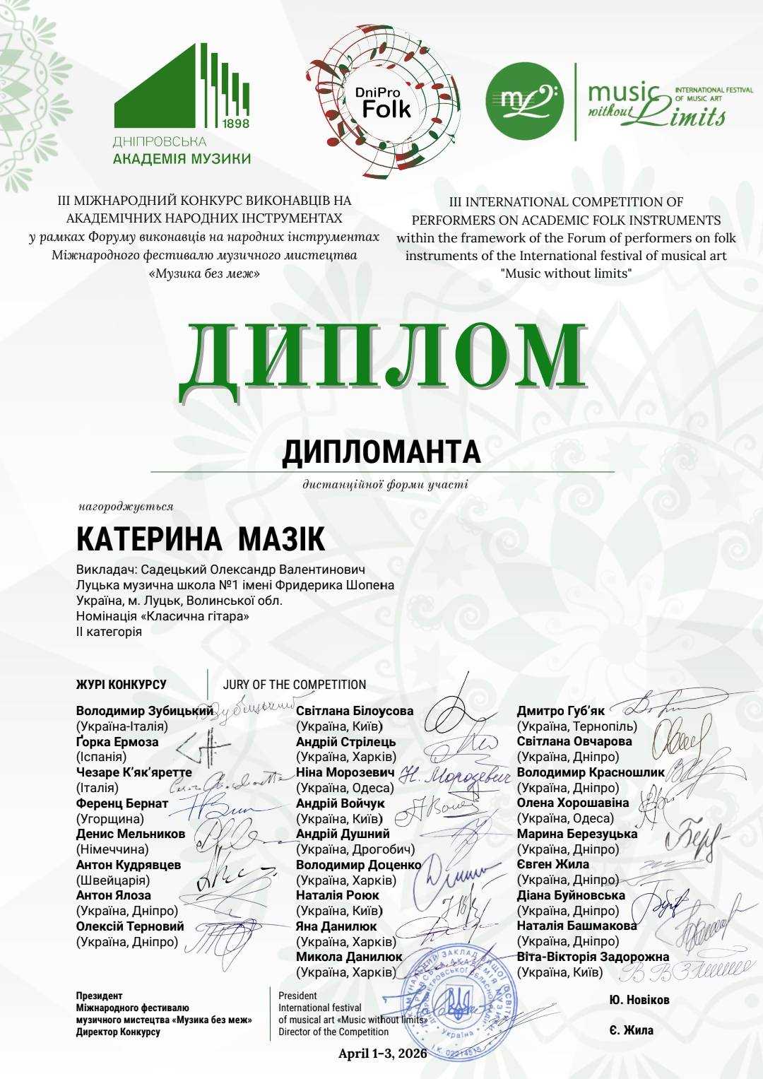 Учні класу гітари гідно представили школу на ІІІ міжнародному конкурсі виконавців на академічних народних інструментах (Dnipro Folk / Music without limits, 2026):
