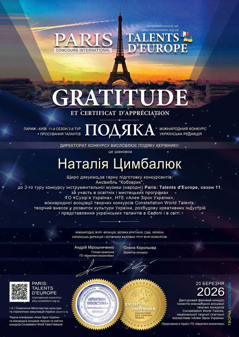 - Наталія Цимбалюк отримала подяку за підготовку колективу,