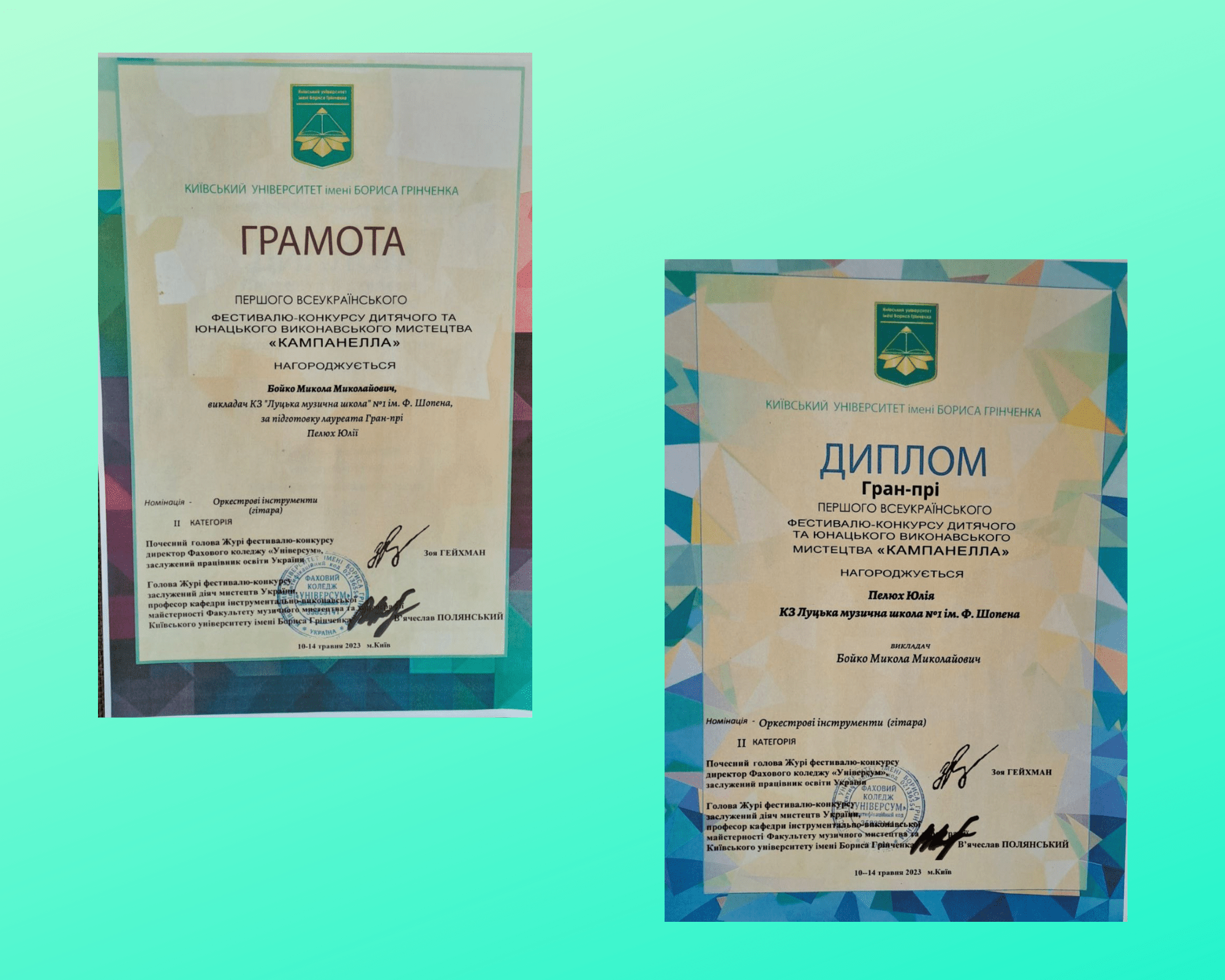 В номінації «оркестрові інструменти(гітара)» вищу нагороду Гран-прі отримала ЮЛІЯ ПЕЛЮХ, викладач Микола Бойко.