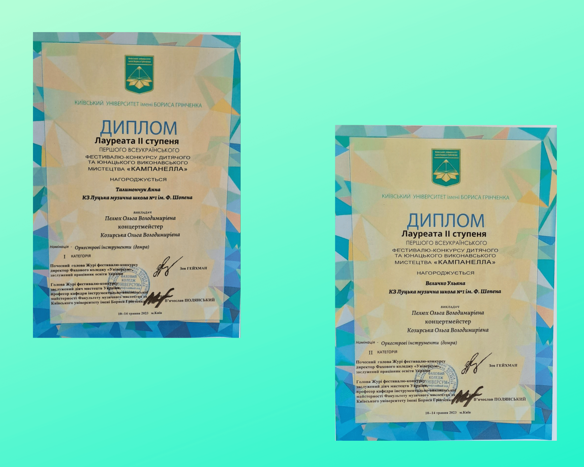В номінації «оркестрові інструменти(домра)» дипломи лауреатів ІІ ступеню отримали АННА ТАЛИМОНЧУК та УЛЯНА ВЕЛИЧКО, викладач Ольга Пелюх, концертмейстер Ольга Козирська.
