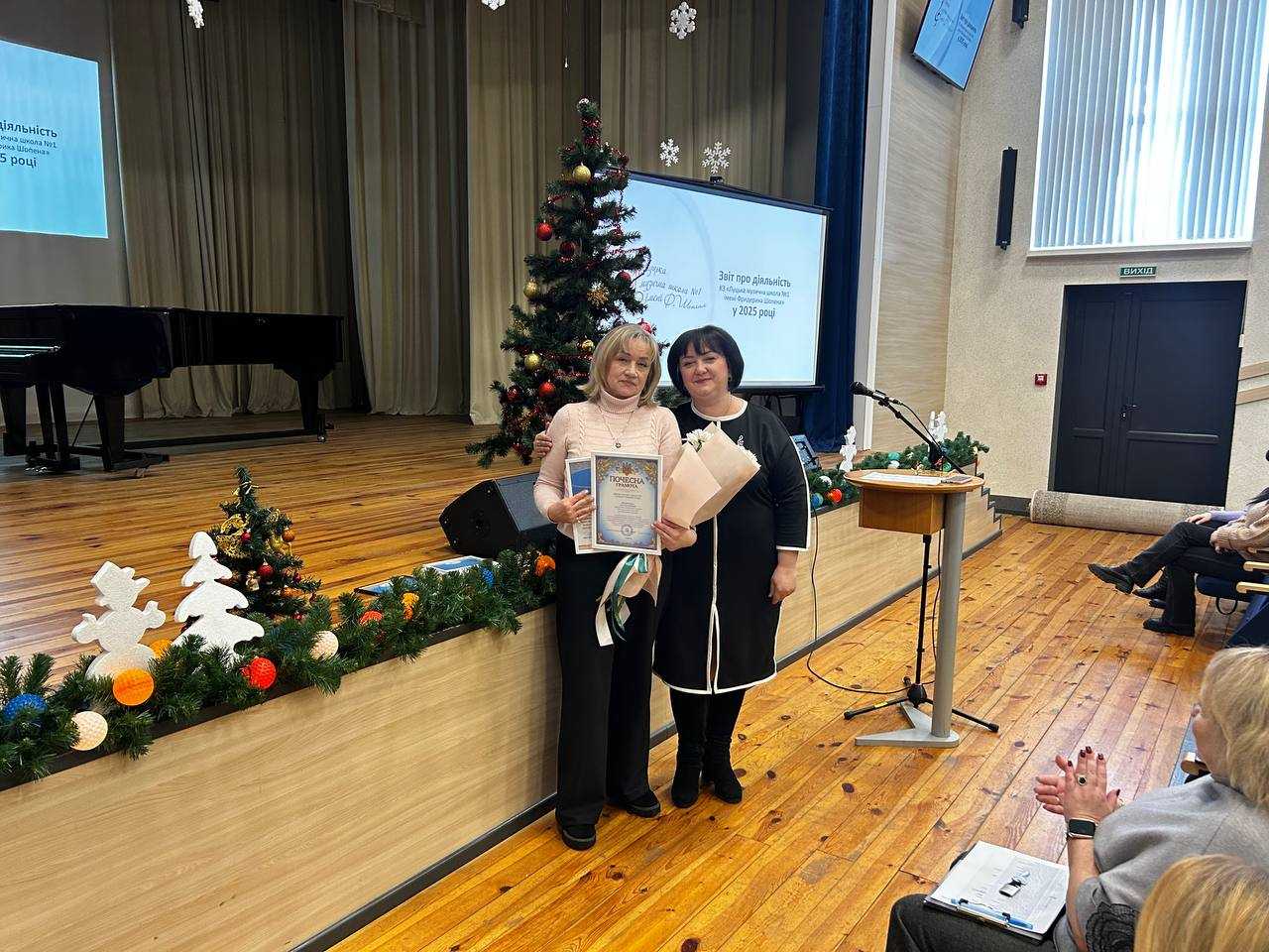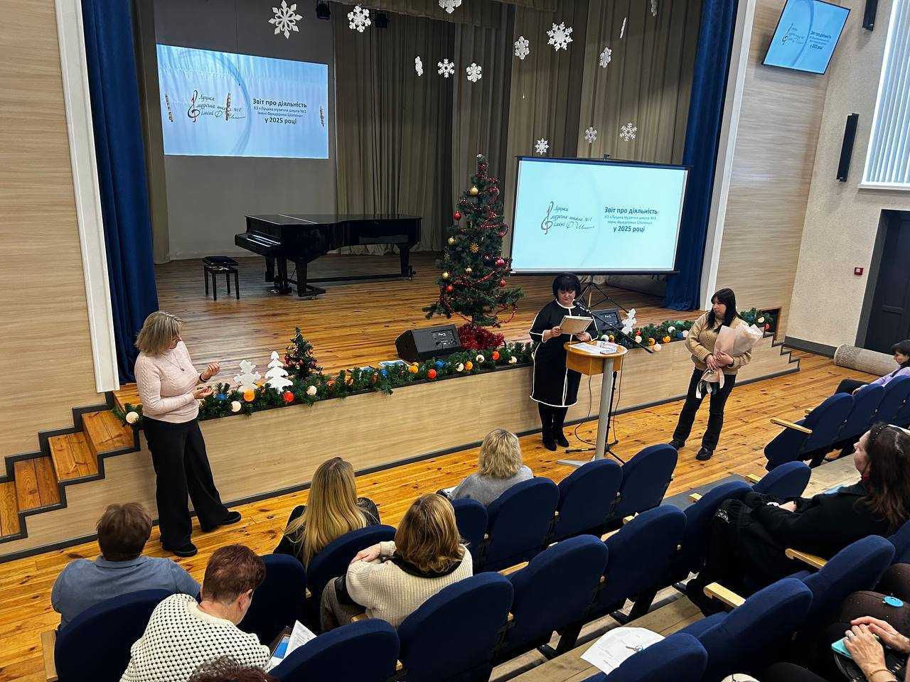 Зі звітами про діяльність школи за 2025 рік перед трудовим колективом виступили представники адміністрації: Ольга Чуріна, директорка школи, та Тетяна Тітяєва, голова первинної профспілкової організації.