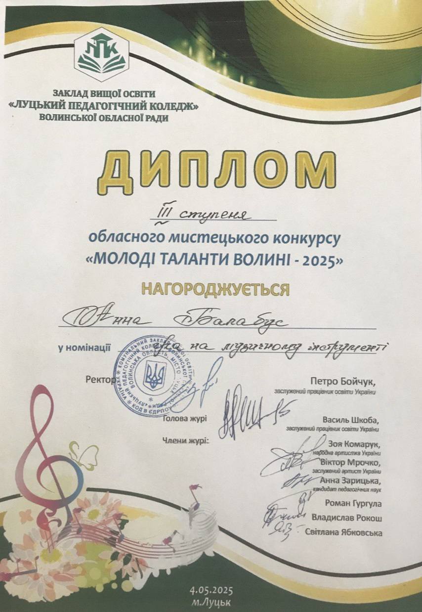 Анна Балабус(викладач Наталія Томчук), учениця відділу струнно-смичкових інструментів отримала диплом