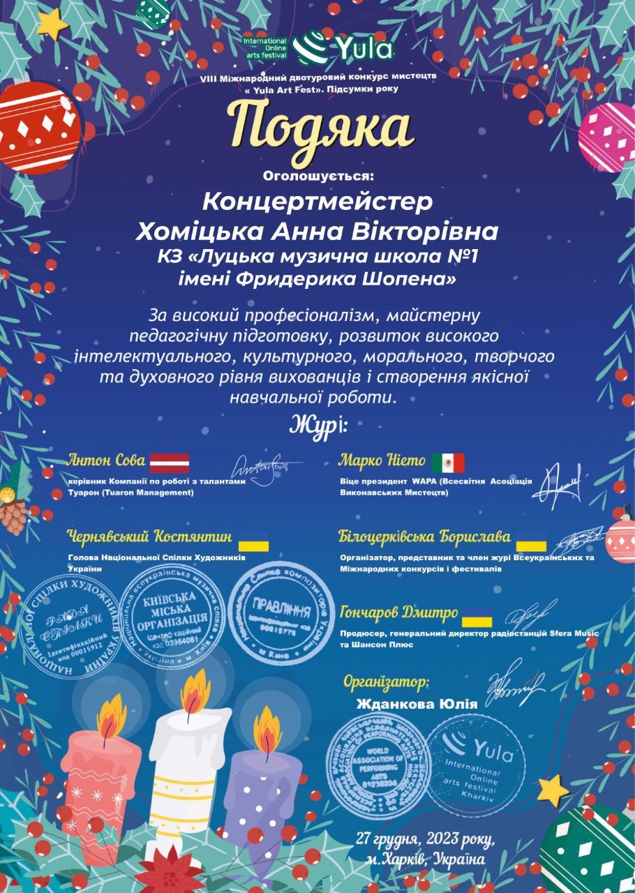 Учениця стала лауреатом ІІІ премії на Міжнародному двотуровому фестивалі-конкурсі «Зимова фантазія – Різдвяні візерунки», який наприкінці 2023 року відбувся у місті Київ.