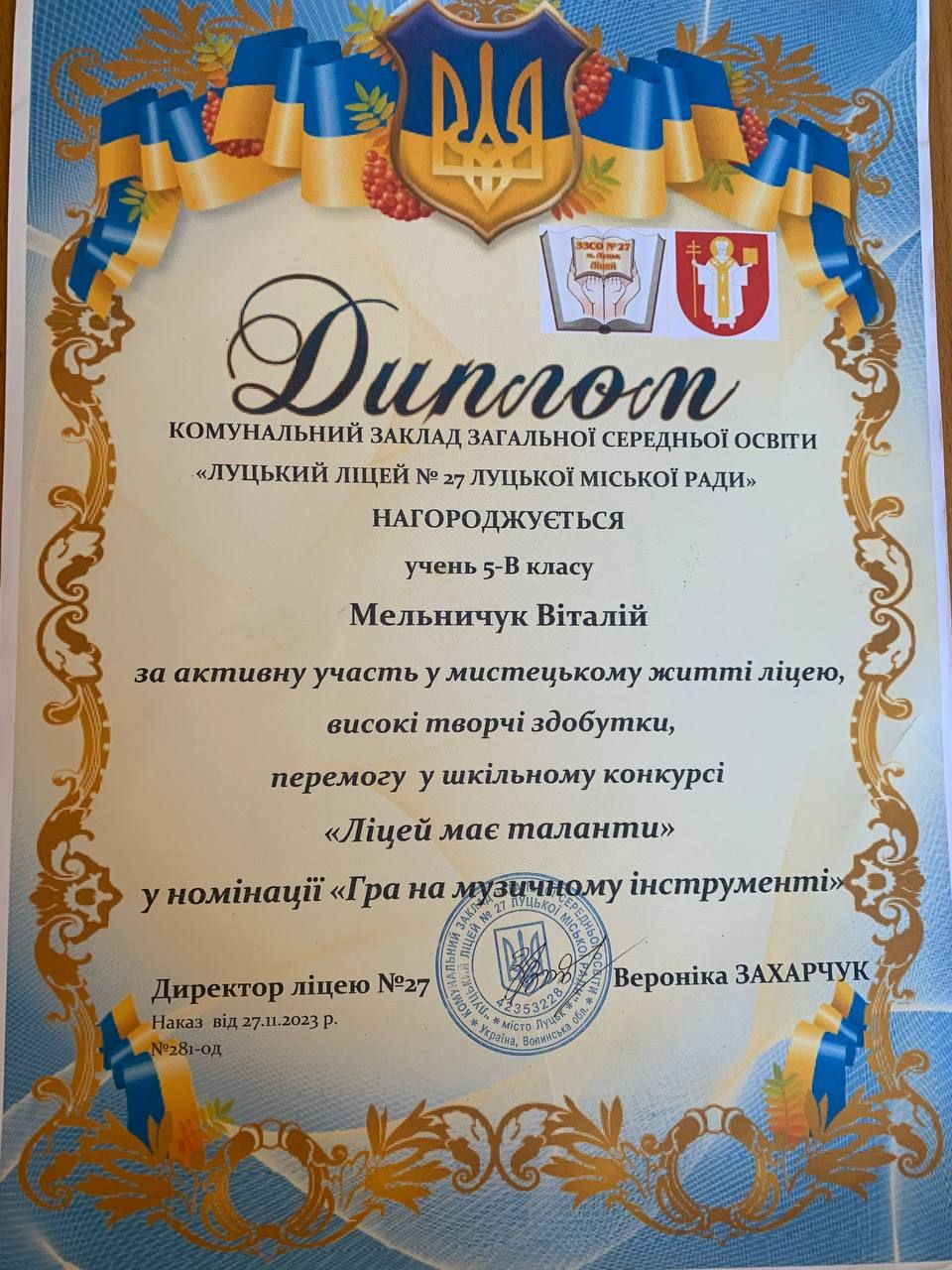 Віталій Мельничук, викладач Наталія Мордись, здобув перемогу у шкільному конкурсі «Ліцей має таланти» у номінації «Гра на музичних інструментах», який проводив КЗЗСО ліцей №27 Луцької міської ради.