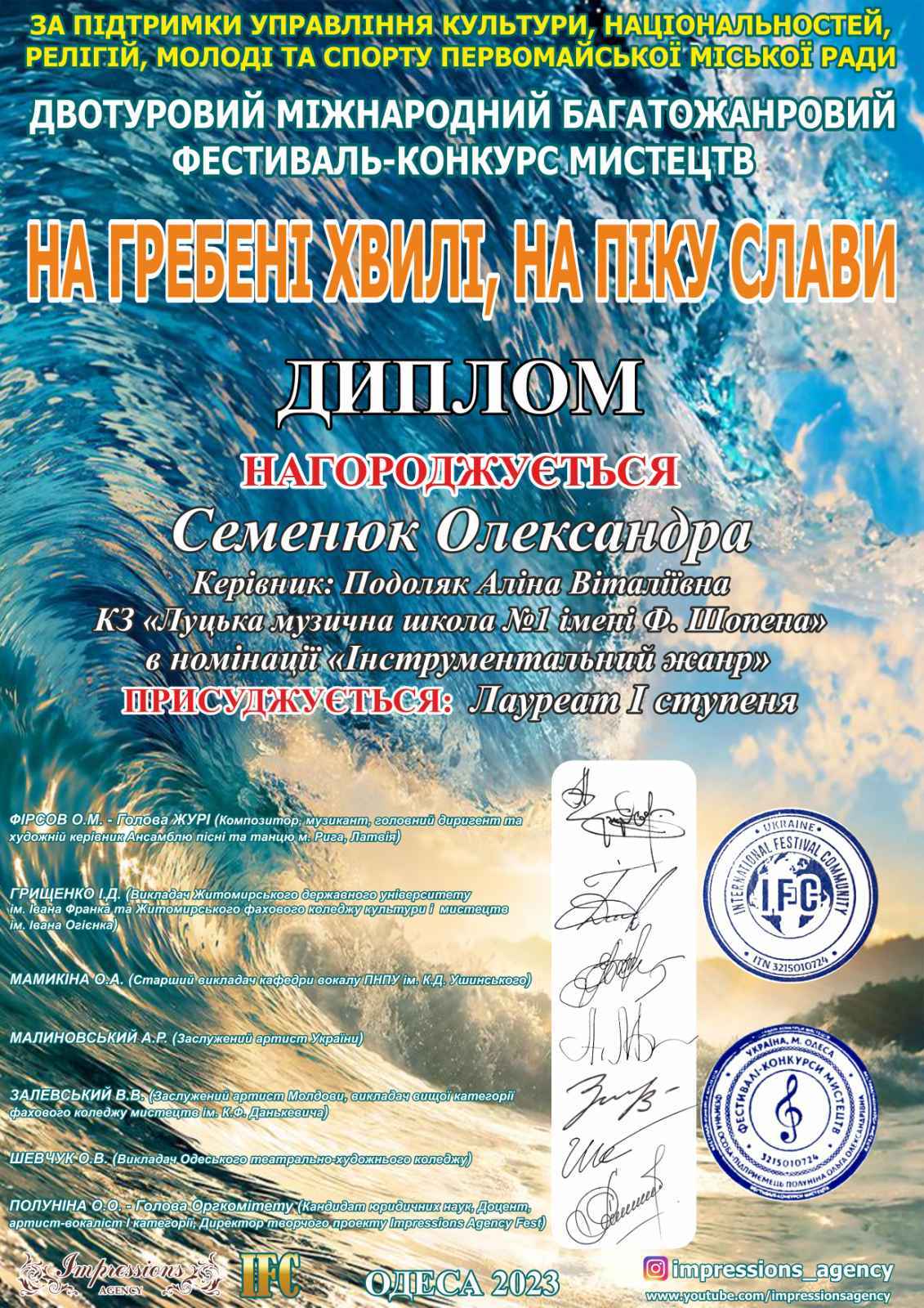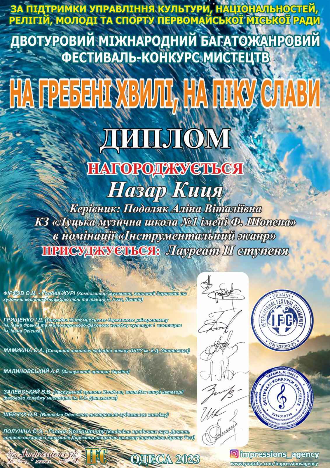 Щиро вітаємо учнів та викладачів відділу струнно-смичкових інструментів Луцької музичної школи №1 імені Фридерика Шопена, які здобули нагороди на Міжнародному багатожанровому фестивалі-конкурсі мистецтв “НА ГРЕБНІ ХВИЛІ НА ПІКУ СЛАВИ” в номінації «Інструментальний жанр»: