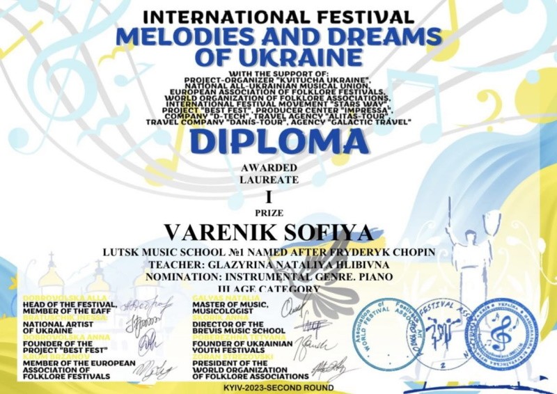Вихованці викладача відділу фортепіано Наталії Глазиріної на міжнародному двотуровому багатожанровому фестивалі-конкурсі «Мелодії і мрії України» від проекту «Квітуча Україна» продемонстрували своє вміння і у підсумку мають наступні результати.