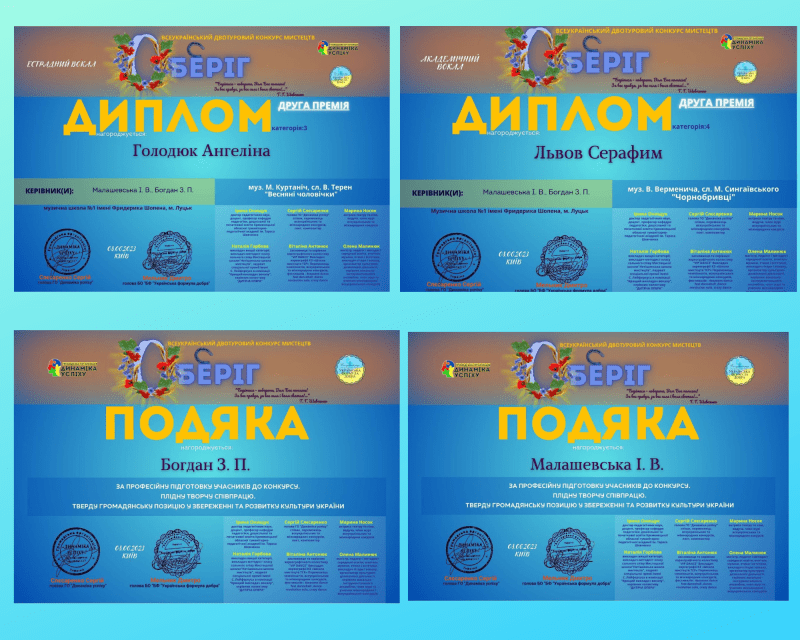 Педагоги нагороджені подяками за професійну підготовку учасників до конкурсу, плідну творчу співпрацю, творчу громадянську позицію у збереженні та розвитку культури України.